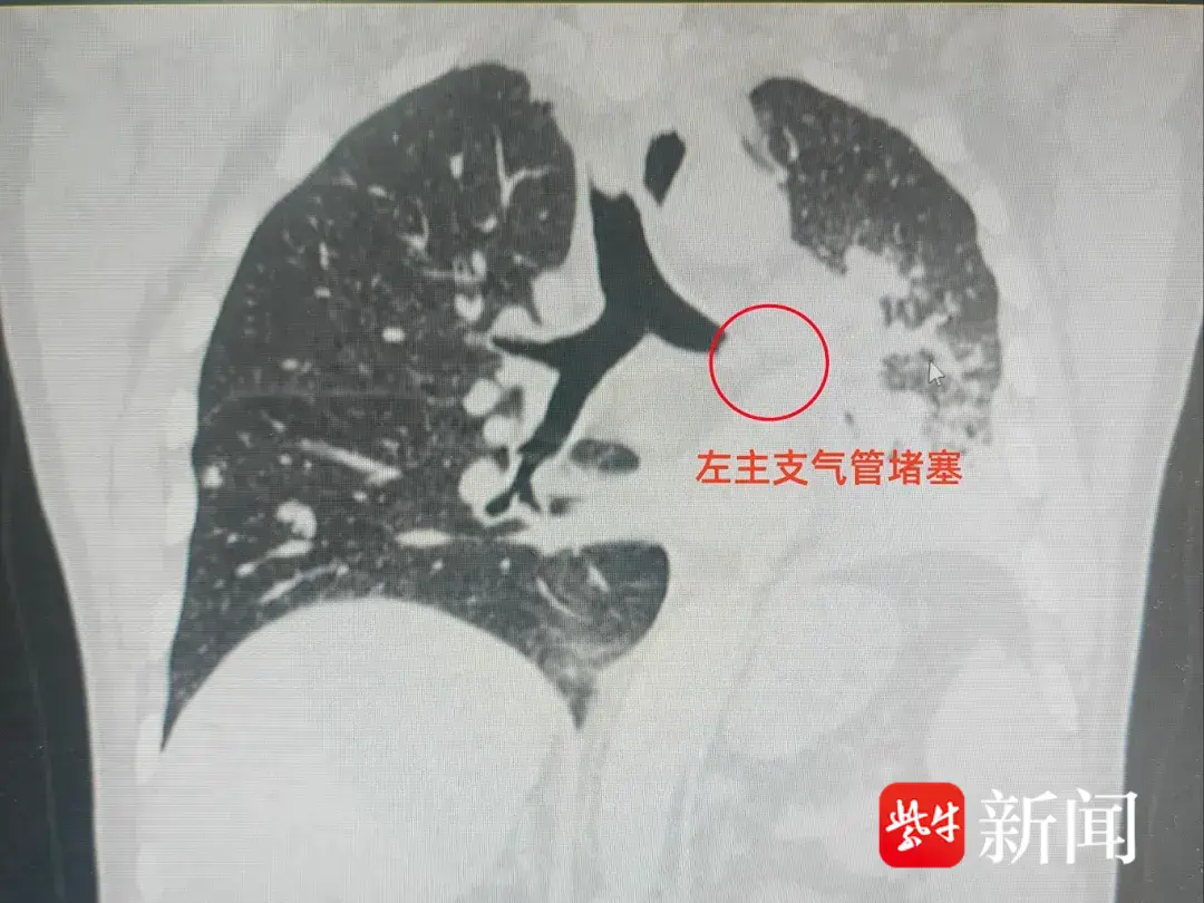 68岁的陈老伯(化名)一年前在当地医院被确诊为肺癌,因初诊时评估无手术适应症,且对抗肿瘤治疗存在恐惧心理,未接受规范治疗。然而,一个月前,肿瘤的进展让他尝到了“窒息”的滋味,他赶紧来到南通六院呼吸与危重症医学科。检查显示:左肺肿瘤已侵犯左主支气管!