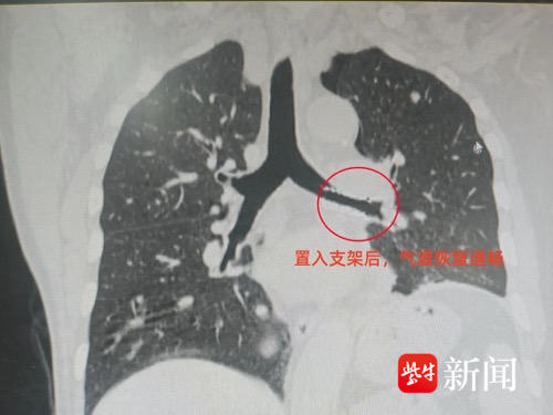 面对“卷土重来”的危机,赵焕主任带领团队果断调整策略,在气管镜下再次进行电凝、电切治疗清除部分肿瘤后,为其植入一枚覆膜气道支架——既物理撑开了塌陷的气道,又隔绝了肿瘤向管腔生长,为后续治疗争取宝贵的时间窗口。