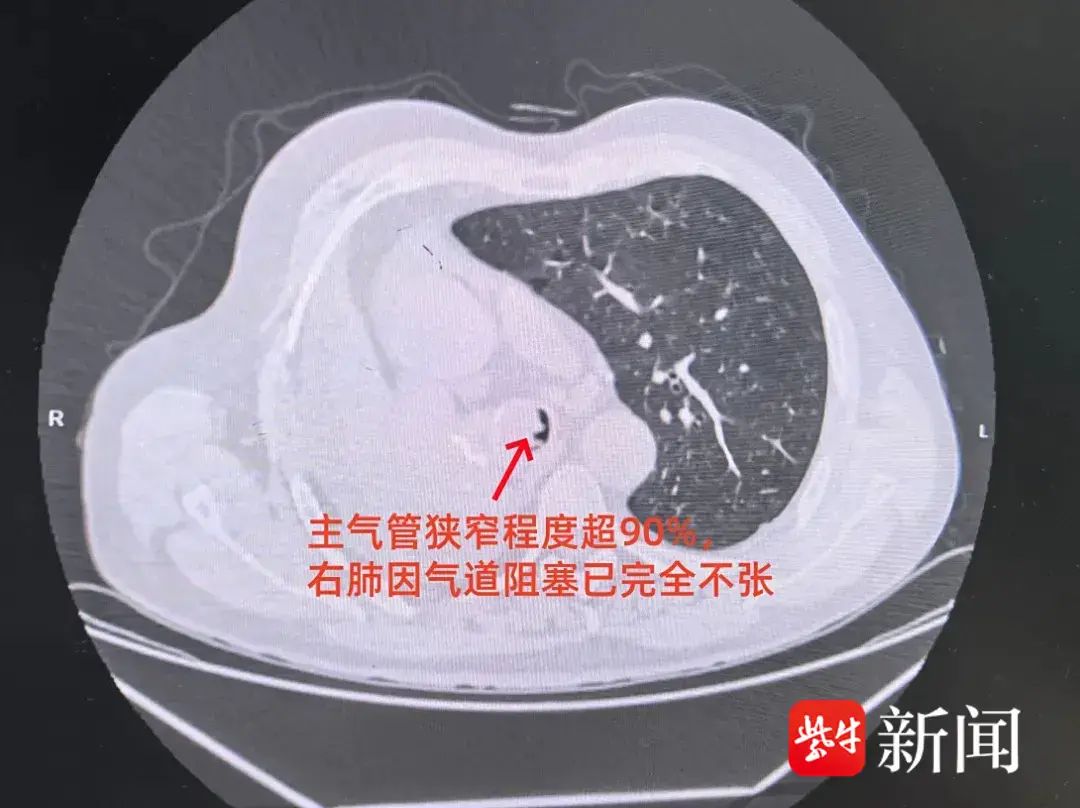 入院时,孙老伯已被严重的呼吸困难折磨得憔悴不堪,需由家人用轮椅推送。检查发现:其主气管狭窄程度超90%,且右肺因气道阻塞已完全不张,呼吸功能严重受损。